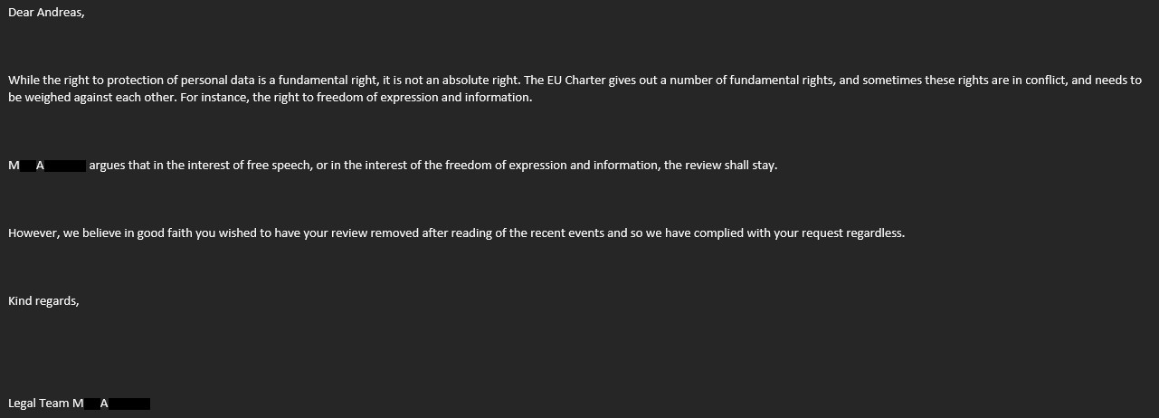 His response was signed with "Legal Team MA" while the mail itself was send from his personal MA-Mail account.