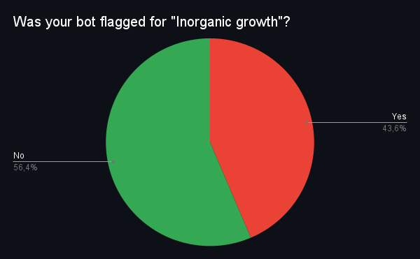 The above graph shows the very first question of my survey, which was whether the dev's bot has been flagged for "Inorganic Growth".